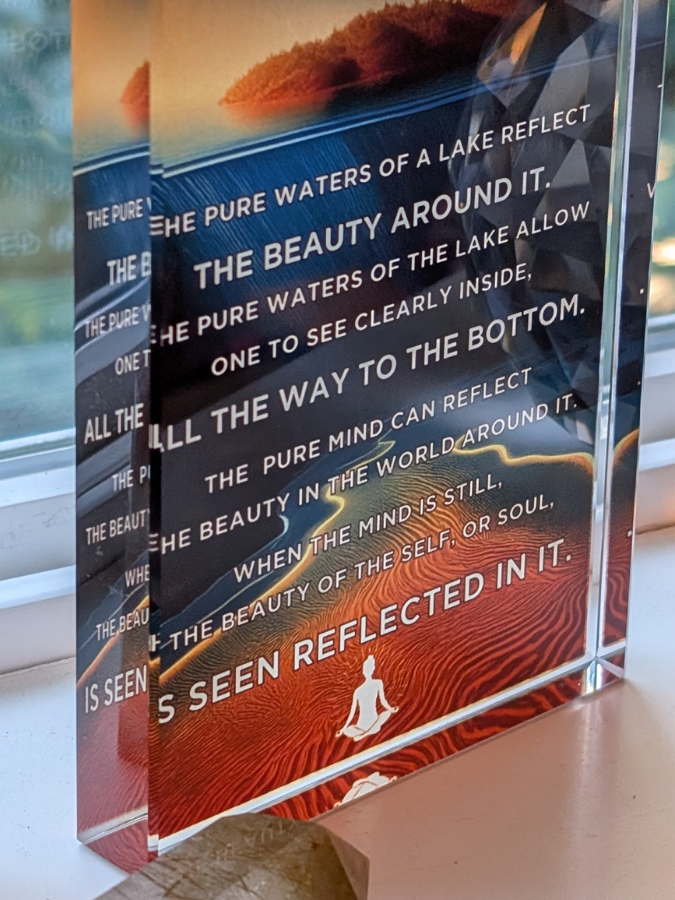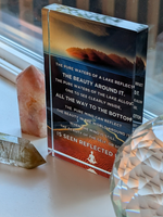 This luminous glass art print captures a quiet lake at sunrise - a reflection of clarity, calm, and the inner world we return to when we slow down.